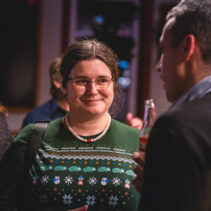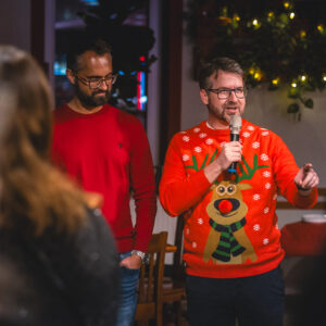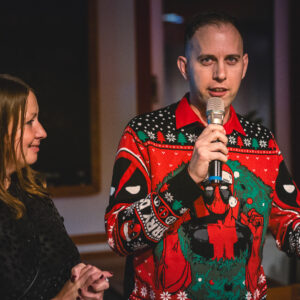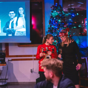The night continued in a cozy holiday spirit – complete with mulled wine, traditional Czech “wasp nest” cookies (vosí hnízda), and a festive costume contest. Amid a sea of Santa hats, Christmas sweaters, and snowflake socks, the crowd voted for their favorite costume – and once again, current Data MBA student Vojtěch Marszalek took home the win. Congrats, Vojta!